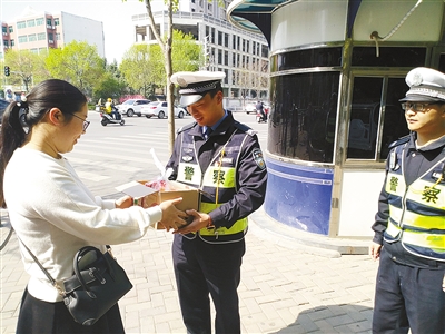 本报讯(记者 齐 放 实习生 李博昊)“你们每天坚守在岗位,风吹日晒,实在太辛苦了,我向你们致敬!”4月1日上午10时许,在市区嵩山路与辽河路交叉口的交警岗亭处,只见一位女士停放好电动车,从车上拿出一个四四方方的纸箱,打开后双手递给了辅警张威。