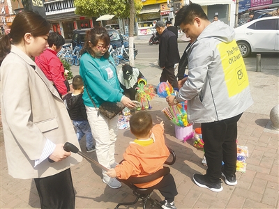 一位市民的孩子看到吹泡泡玩具后,便向家长要钱买。拗不过孩子,这名市民只得花3元钱给孩子买了一个。
