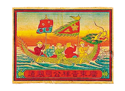 清末,广东吉祥公司也推出过“龙舟”火花,画面为龙舟竞渡翻江入海的壮观场面。细看这枚火花,龙头高昂,生动有神,舟上插有旗帜与红罗伞,舟上右三左二共五名桨手在奋力划桨,画面虽然犯了左右人数不一致的错误,但也算别具一格。