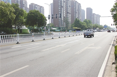 市区泰山北路早已通车,昨天,泰山北路与淞江路交叉口路口,仍然缺少左转标识。本报记者 李林润 摄