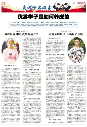 “这次考试,马思怡发挥得不错,在平时,她成绩在年级里也经常名列前茅,这些都得益于她学习有计划,自律能力强。”马思怡的班主任张晓向说,好学生有一个共同点,他们从来不死学,习惯特别好,学习很有计划,不需要管理,作为老师主要任务是引导、点拨,让他们更进一步,其他的全靠学生自律。