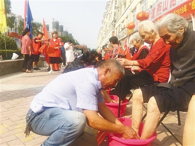 9月27日,召陵区燕山路社区开展重阳节敬老活动。图为社区居民为母亲洗脚。