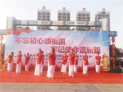 9月29日下午,在市区双汇广场,源汇区马路街办事处举办迎国庆文艺会演,居民们载歌载舞表达对祖国的祝福。本报记者 于文博 摄