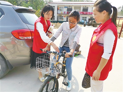 9月28上午,我市志愿者到临颍县杜曲镇郝路口村贫困学生李婧源家中,为她送去一辆自行车等物品。