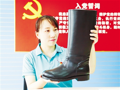 “我们发现,在训练过程中官兵腿脚尺寸会发生变化,训练初期是一个尺寸,训练中间肿胀后是一个尺寸,工作人员就根据脚型重新调整。”公司军品开发主管方婷婷介绍说,有官兵反映踢正步时脚底减震不太好,经过研究就就在鞋底加装橡胶垫片,起到减震作用。就这样不断改进,最终一双完美的阅兵靴呈现在大家面前。