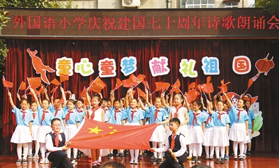 国庆节前夕,源汇区外国语小学举行以“童心童梦 献礼祖国”为主题的诗歌朗诵会,为祖国母亲庆生。 许盈盈 摄 |