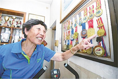 30多年来,陈序华得了很多奖牌,其中印象最深的,是2016年10月份,77岁的她在澳大利亚参加第22届世界老将运动会时,取得的一块女子2000米障碍赛的金牌。那场比赛她的成绩是11分30秒55,打破了英国人保持了5年之久的世界纪录。