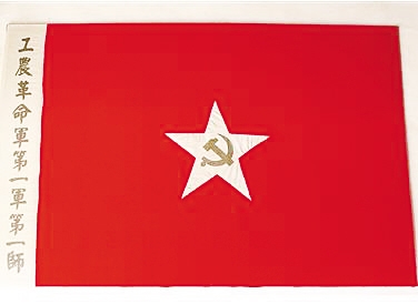 9月初,根据前敌委员会的指示,制作军旗的任务落在了师部参谋何长工、参谋处处长陈树华和副官杨立三身上。他们认为,中国工农革命是在共产党的领导下进行的,通过武装斗争,使革命的星火燃遍全国。在这样的理念指导下,三位设计者几经思索、反复比较、推敲修改后,一面庄重、神圣、鲜艳,凝聚工农革命意义的军旗诞生了。旗底为红色,象征革命事业;旗帜中央缝着一个大五角星,象征中国共产党;五角星内是镰刀和斧头图案,代表工农;靠旗杆处镶有一条10厘米宽的白色布条,上面写着“工农革命军第一军第一师”的番号。“镰刀斧头”旗,是中国共产党人立足革命需要和人民群众期盼,破旧立新、敢想敢干,设计出的带给中国工农革命光明与希望的首面军旗,指引着中国工农革命朝着胜利的目标不断前行。