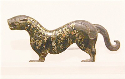 虎符,很有名气,是“军用身份证”,调兵的信物,战国和秦汉比较流行,分左右,右符放在中央,左符交给将领,两符合一才能调动军队。唐朝不用虎符的原因是为了避讳祖宗李虎之“虎”。