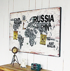 一幅世界地图木板装饰画,粗糙的质感仿佛是旅行沧桑的印记。
