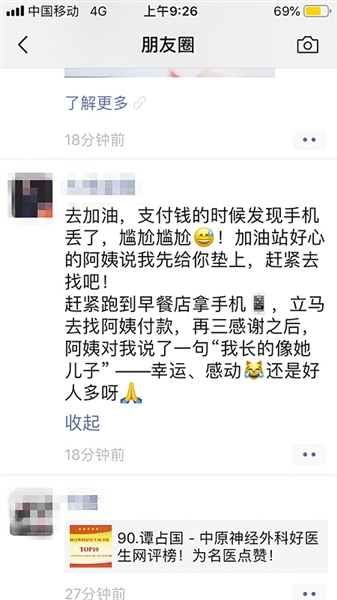 拿回手机后,赵阳连声表示感谢,又赶紧返回加油站,将阿姨垫付的油费还给她。“一早上遇到了两位好心人,真是又幸运又感动,十分感谢他们。”赵阳说。