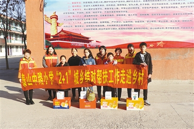 12月5日,源汇区泰山中路小学教师,带着慰问品来到大刘镇初中和小学,看望“2+1”帮扶的孩子。李彩霞 李金萍 摄