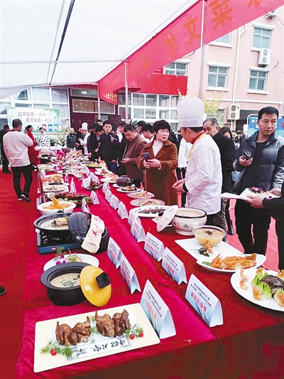 与往届大赛的规则略有不同,今年不限食材,任由厨师发挥。煎、炒、烹、炸、焖、溜、熬、炖,比赛中,各位大厨使出浑身解数,可谓是“八仙过海、各显神通”。原本常见的食材,经厨师处理后变成美味佳肴。当象牙大排、鲍汁鲈鱼、兰花虾尾等一道道精致的菜品摆在展示台上,让人觉得这不仅是美食盛宴,更是视觉盛宴。除了菜品,现场展示的千层饼、杠子馍等本地小吃同样令人垂涎欲滴。