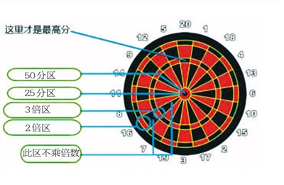 首先了解飞镖的基本规则:圈外为分值,盘中分三倍区、二倍区、单倍区。靶心为50分,靶心外圈为25分。最高分区并不是靶心,而是20分区域中的三倍区,即60分。