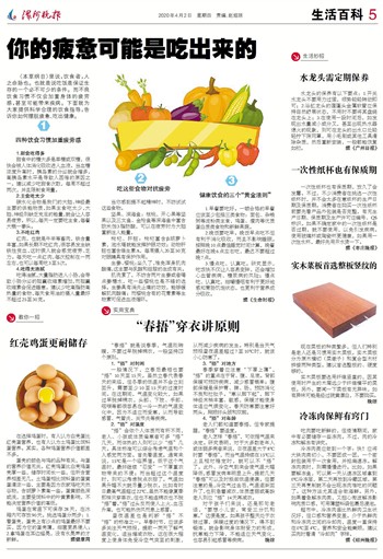 春季穿着应注意“下厚上薄”,“捂”的重点在于背、腹、足底。背部保暖可预防疾病,减少感冒概率;腹部保暖是保护胃、脾、肠,预防消化不良和拉肚子。“寒从脚下起”,脚下神经末梢丰富、敏感,保暖才能使身体适应气候变化。春天防寒要注意好两头,照顾好头颈和双脚。