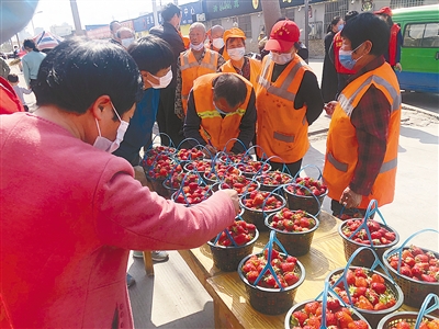 “新鲜的草莓,每位环卫工可以免费领一篮。”4月15日,在市区纬一路爱心粥屋门前,负责人高红热情地招呼着前来领取草莓的环卫工。