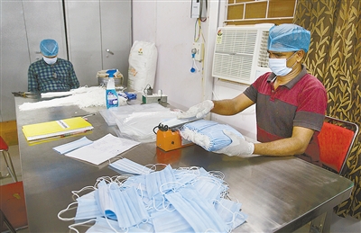 4月14日,在印度新德里,一名工作人员在制作口罩。印度新冠肺炎疫情近日持续蔓延。印度卫生部14日发布的数据显示,截至当天上午8时,印度累计新冠肺炎确诊病例增至10363例,累计死亡339例。