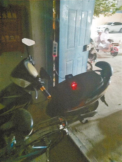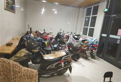 天鑫现代城小区21号楼2单元一楼大厅停满电动车。