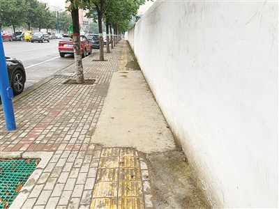 近日,有市民向记者反映,市区汉江路与井冈山路交叉口向西路南的人行道上,有多处雨污分流工程施工结束后,被挖开的盲道只用混凝土抹平,没有使用盲道专用砖,既不美观又存在安全隐患。