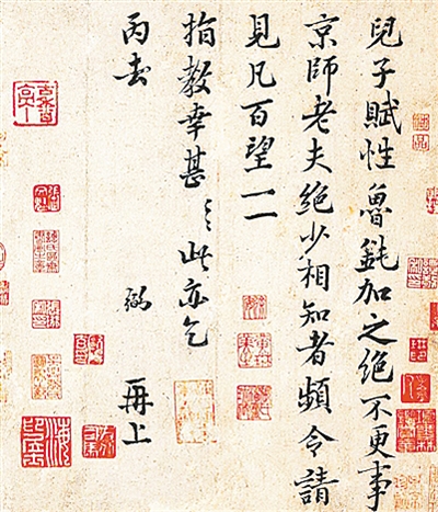 富弼为官清廉,但他为儿子有求于人时,却显得有些难以启齿,信尾还特意嘱咐对方“阅后即焚”。然而,这封信并没有如愿销毁,想必收信者也觉得此墨迹甚是有趣,于是保留下来。此帖上钤历代藏家如欧阳玄、项元汴等人的鉴藏印数十方,弥足珍贵。