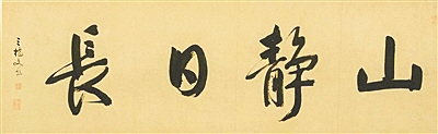 《山静日长图》现藏于济南市博物馆。此卷引首处有文徵明长子文彭题行书“山静日长”,钤印“停云”,落款“三桥文彭”,款署钤印“文氏寿承”“两京国子博士”。手卷拖尾处有文徵明行书诗文,描写的是诗意的山林栖居生活。文徵明行书深受元代赵孟頫影响,风格秀丽温润、气韵流畅。卷中画心部分为文徵明次子文嘉所绘《山静日长图》,水墨苍润,境界清旷。画面内容是按照其父行书部分的内容创作,描画了文徵明晚年归隐山林的生活状态。