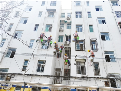 6月22日下午,记者来到市区泰山路海河小区。刚刚走进小区,记者就看到多名工人在高空作业:粉刷住宅楼外墙。