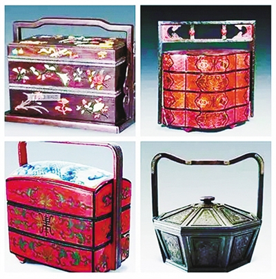 ▲食盒:是专门盛放食物酒菜、便于携带行走的长形或圆形抬盒,有木、竹、珐琅、漆器等材质,其中以木质的居多,内有数层不等。酒肆饭店以及富贵人家常用。