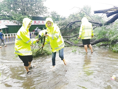 7月21日晚上8时许,市园林绿化养护中心工作人员对市区主次干道、游园等容易内涝和易积水区域昼夜不停巡查,对威胁到人、房屋、道路、电缆等安全的倒伏树木及时处理,保障道路通行安全。“嵩山路南段树木倒伏,砸到了信号灯;淞江路、解放路交叉口树木倒伏,砸到了路边停放车辆……”22日上午,市区多处路段发生树木倒伏。园林工人分工明确、紧密配合,有的锯树,有的搬运,有的扶正树木打支撑,有的帮忙推车,齐心协力处理险情。截至22日中午12时,共清理倒伏树木30余处、折枝200余处、清淤疏堵16处。