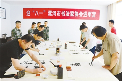 7月28日上午,市书法家协会开展迎“八一”书法家进军营活动。书法家到源汇区人民武装部挥毫泼墨,写下一幅幅体现军人气概的书法作品,为基层官兵送上节日祝福。