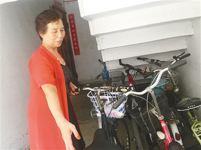 田爱雪将停放在楼梯间的自行车移到外面。
