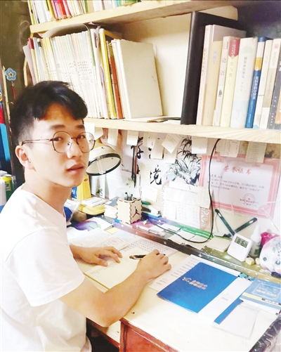 8月28日下午,记者走进包建豪的家。他家的房屋位置有些偏僻,但打扫得十分干净。此时包建豪正在书桌前为大学英语四六级分级考试做准备,他的书桌旁堆满各类书籍,既有学习的教材、辅助资料,也有一些文学名著及《论语》《淮南子》等国学经典。
