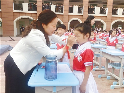8月30日,源汇区许慎小学南校区举办一年级新生“开笔启蒙 慧悦人生”开笔礼,通过自正衣冠、朱砂开智、击鼓明智、开笔破蒙等环节,为学生启蒙。本报记者 李文姣 摄