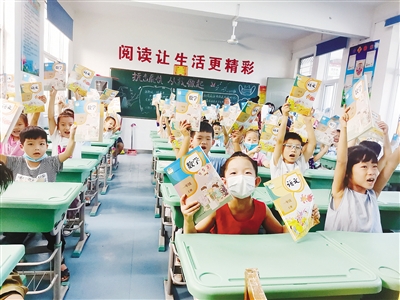 8月29日,召陵区翟庄中心小学新入学的一年级新生领到课本,开心不已。郑小红 摄