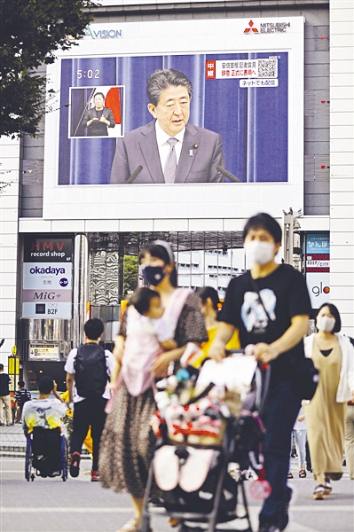 东京一处电子屏幕播放安倍晋三出席记者会的画面。