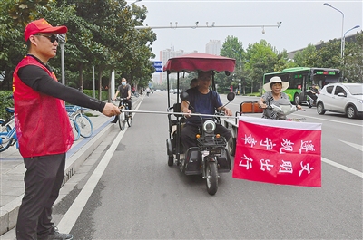 9月9日中午,记者在街头看到,无论是交警、环卫工人还是志愿者,都坚守岗位,为我市创文奉献力量。图为志愿者在路口帮忙维护交通秩序。