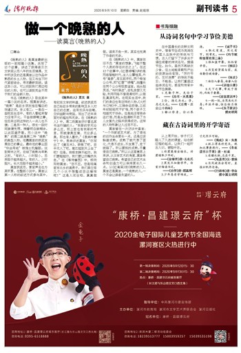 莫言曾在一次访谈中直言:“一个作家或艺术家,为了使他的创作生命更长一点,还是应该躲避成熟。成熟了就代表了固化,代表不成长、不发展了、走下坡路了。所以要抵抗成熟,尽量使自己晚熟。”所以从这层意思上来讲,从文学艺术的角度,莫言希望自己晚熟。希望自己的艺术生命和创造力可以保持更长久一点。从《红高粱》到《晚熟的人》,莫言还是莫言,一个晚熟的人,一个不会让读者失望的人。
