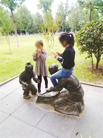 国庆假期,个别游客在游玩时随意攀爬景区雕塑。