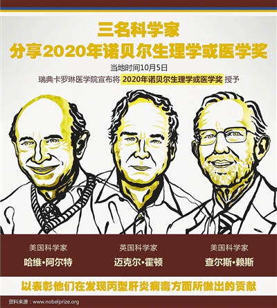 瑞典卡罗琳医学院10月5日宣布,将2020年诺贝尔生理学或医学奖授予美国科学家哈维·阿尔特、查尔斯·赖斯以及英国科学家迈克尔·霍顿,以表彰他们在发现丙型肝炎病毒方面所做出的贡献。