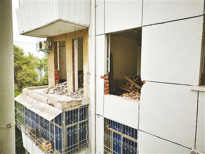 10月20日上午,记者来到泰山小区三号楼。在楼下,几位工人正在通过五楼住户的窗户,用吊机往下运送碎砖块。在这户居民家中,所有的门窗已经拆除,地面上到处都是碎砖。