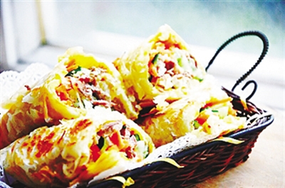 3.将切好的黄瓜丝、胡萝卜丝、肉、酱,放在膨松酥脆的饼上,卷起来趁热吃。据《北方新报》