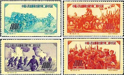 1952年11月15日,原邮电部发行《中国人民志愿军出国作战二周年》纪念邮票一套4枚,邮票图案分别为“志愿军出国作战”“支援前线”“涉江追击敌人”和“胜利会师”。该套邮票以4幅战争时期的画面,描述了这一英雄壮举的概况。