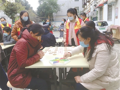11月25日,在市区受降路毓秀苑小区,源汇区老街街道滨西社区举办“我文明 我健康 我参与 我快乐”文体活动,丰富居民业余生活,宣传文明健康的娱乐方式。活动现场,居民们三三两两地聚集在一起,有的下象棋,有的下跳棋,有的打扑克,大家边玩边聊,气氛融洽。