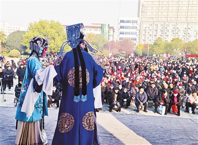 ←12月10日,市豫剧团在黄河广场为附近居民送上了一场视觉盛宴。根据河南省人民政府、漯河市人民政府工作安排,市豫剧团开展了“舞台艺术送基层”文艺演出活动,受到群众热烈欢迎。