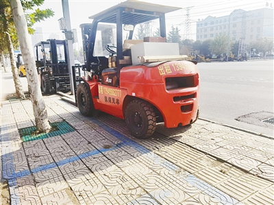 12月10日,市区人民路与燕山路交叉口,叉车占压盲道。见习记者 万天宇 摄